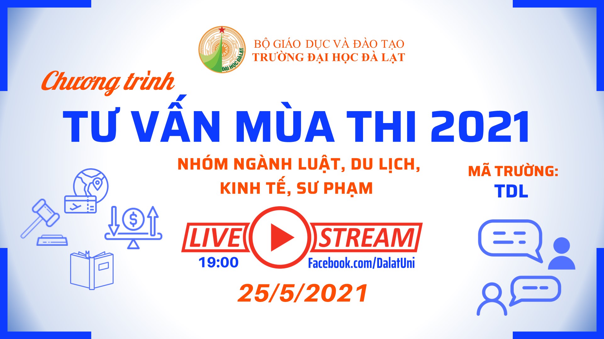Trong khuôn khổ hoạt động tư vấn tuyển sinh, tư vấn hướng nghiệp năm 2021, vào cuối tháng 5 và đầu tháng 8, Trường Đại học Đà Lạt thực hiện chuỗi chương trình “Tư vấn mùa thi 2021” trực tuyến.