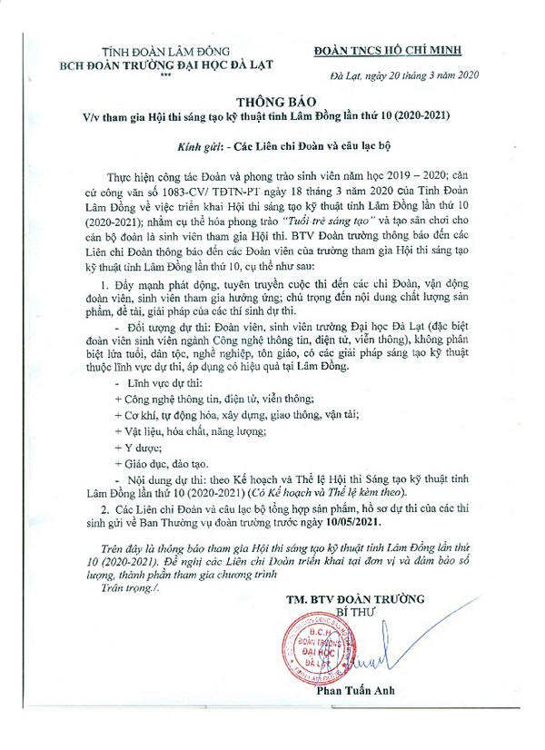 Thông báo tham gia Hội thi sáng tạo kỹ thuật tỉnh Lâm Đồng lần thứ 10 (2020-2021) Thông báo Đoàn Hội 2020-08-242021-03-25 626