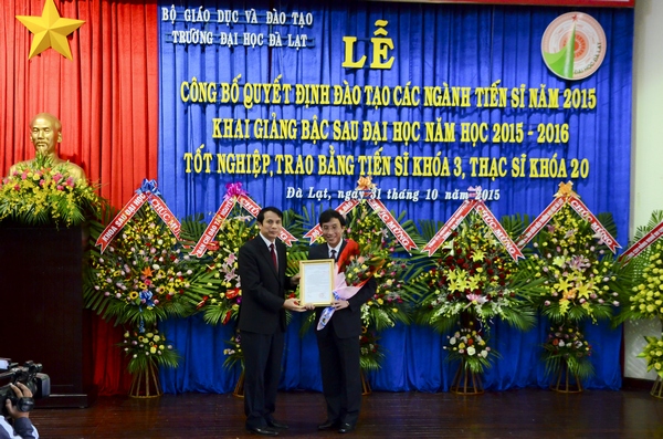 Thay mặt Bộ Giáo dục và Đào tạo, Thứ trưởng Phạm Mạnh Hùng đã trao Quyết định của Bộ trưởng cho phép trường Đại học Đà Lạt đào tạo trình độ tiến sĩ 04 chuyên ngành: Vật lý kỹ thuật, Hóa phân tích, Sinh thái học và Lịch sử Việt Nam từ năm 2015.