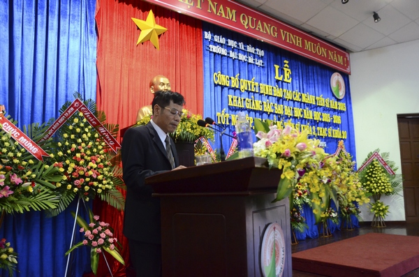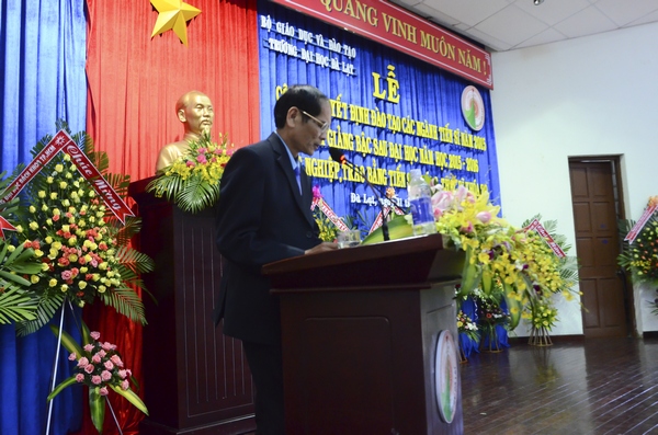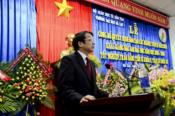 Tại buổi Lễ, PGS.TS. Nguyễn Đức Hòa – Bí thư Đảng ủy, Hiệu trưởng đã đọc diễn văn ghi nhận, đánh giá cao những đóng góp của các nhà khoa học cho sự nghiệp đào tạo của trường Đại học Đà Lạt, chúc mừng các tân Tiến sĩ, tân Thạc sĩ đã xuất sắc hoàn thành chương trình đào tạo theo đúng kế hoạch, chúc mừng các tân học viên đã vượt qua kỳ thi tuyển sinh cao học năm 2015 và trúng tuyển vào khóa 23 của trường. Hiệu trưởng Nguyễn Đức Hòa gửi lời cảm ơn các giảng viên sau đại học, các trường đại học, các Viện nghiên cứu đã cộng tác và đồng hành cùng với trường trong quá trình giảng dạy, hướng dẫn, phản biện và tham gia các Hội đồng chấm luận án Tiến sĩ giúp trường Đại học Đà Lạt.