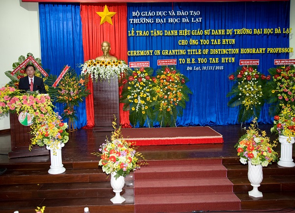 Mở đầu chương trình, được sự ủy quyền của Ban Tổ chức, ThS. Nguyễn Viết Lan, Trưởng phòng Tổ chức – Hành chính công bố Quyết định của Hiệu trưởng Trường Đại học Đà Lạt về việc Trao tặng Danh hiệu Giáo sư Danh dự cho Ông Yoo Tae Hyun.