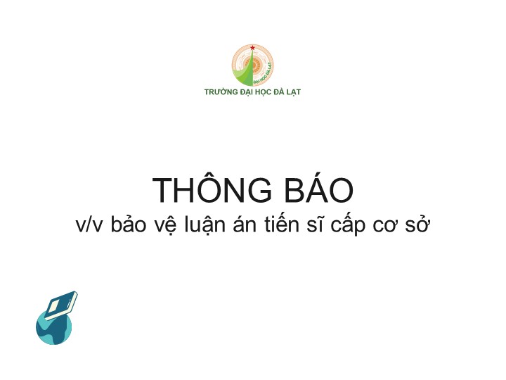 Trường Đại học Đà Lạt thông báo về lịch bảo vệ luận án tiến sĩ cấp cơ sở của nghiên cứu sinh Nguyễn Thanh Nguyên – Chuyên ngành Sinh thái học. Trân trọng kính mời các nhà khoa học, giảng viên, nghiên cứu sinh, học viên cao học, sinh viên và cá nhân quan tâm đến tham dự.