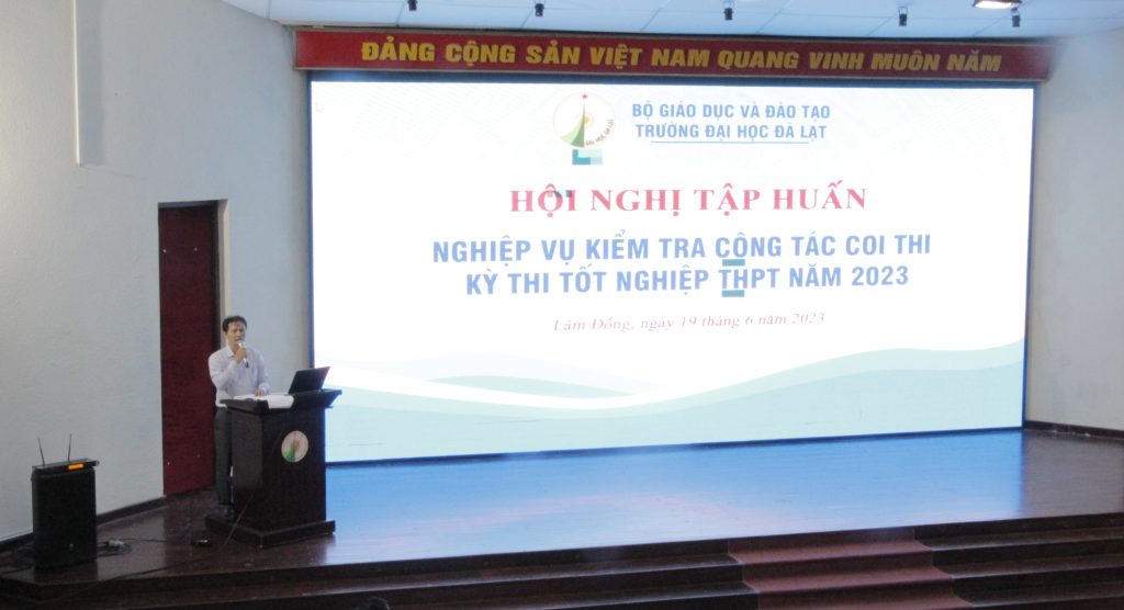 Chiều ngày 19/6/2023, tại Hội trường Thư viện, Trường Đại học Đà Lạt tổ chức tập huấn nghiệp vụ kiểm tra công tác coi thi Kỳ thi tốt nghiệp THPT năm 2023 cho hơn 70 viên chức, giảng viên sẽ thực hiện nhiệm vụ kiểm tra công tác coi thi Kỳ thi tốt nghiệp THPT năm 2023.