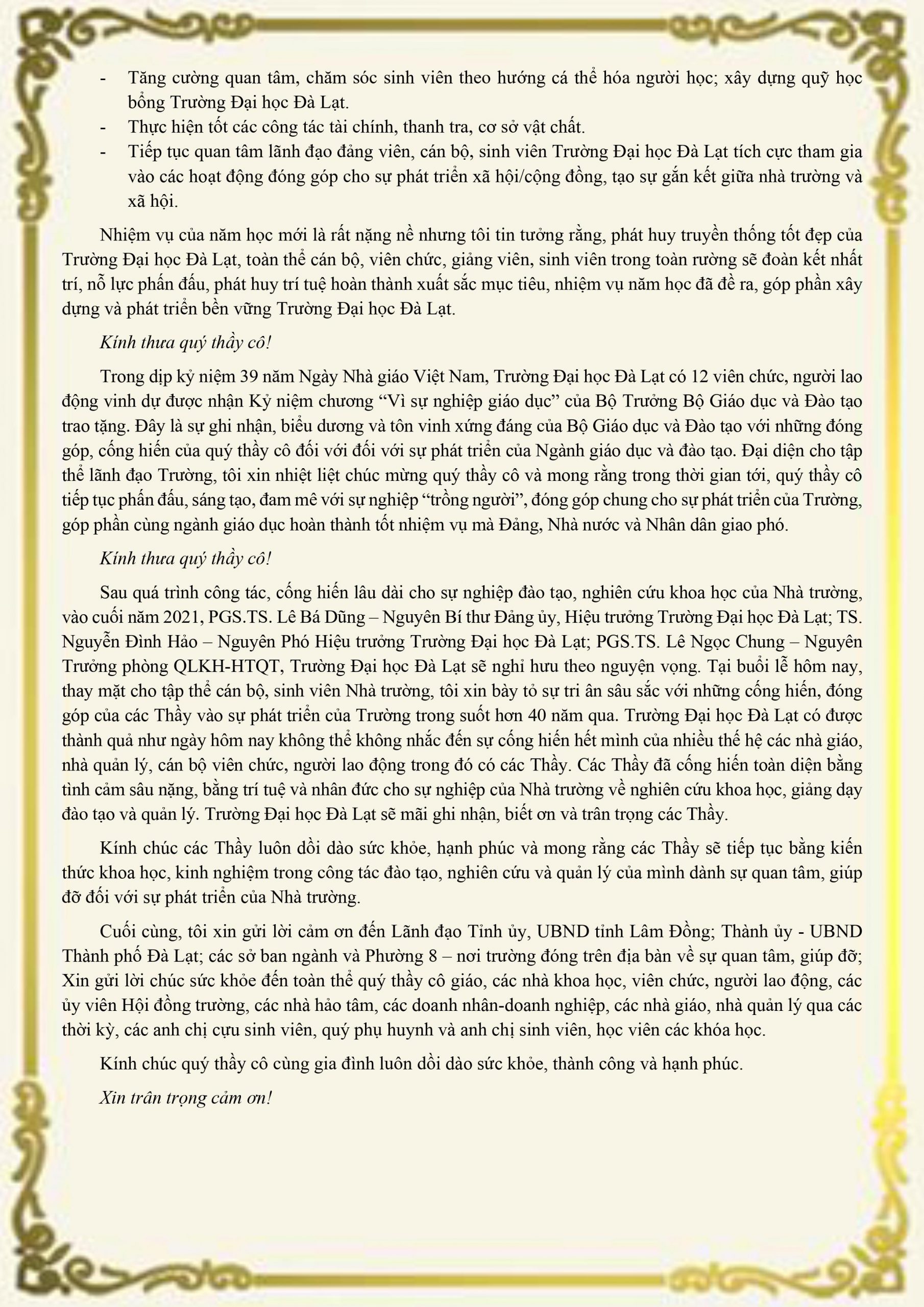 Phát biểu tại buổi lễ, TS. Lê Minh Chiến đã gửi lời chúc mừng tốt đẹp nhất đến toàn thể quý thầy cô giáo, nhà quản lý, viên chức, người lao động của Trường nhân dịp kỷ niệm 39 năm Ngày Nhà giáo Việt Nam. Hiệu trưởng đã điểm lại những thành tựu mà Trường đã đạt được trong năm học 2020 – 2021 và những nhiệm vụ trọng tâm của năm học mới 2021 – 2022. Mặc dù phải đối mặt với rất nhiều khó khăn, thử thách do đại dịch Covid-19 gây ra, tập thể viên chức, người lao động và người học toàn Trường vẫn luôn đoàn kết, nỗ lực phấn đấu, hoàn thành tốt các mục tiêu, kế hoạch đề ra, tiếp tục củng cố và khẳng định vị thế của Trường Đại học Đà Lạt trong hệ thống giáo dục đại học Việt Nam. Hiệu trưởng cũng mong muốn quý thầy, cô giáo, viên chức, người lao động của Trường sẽ tiếp tục nâng cao hơn nữa tinh thần đoàn kết, lòng trách nhiệm, sự tận tụy và tâm huyết với nghề, phát huy hết tiềm năng, sức sáng tạo để hoàn thành xuất sắc các nhiệm vụ được giao; đồng thời, mỗi thầy cô giáo phải thực sự là một tấm gương sáng để sinh viên noi theo, góp phần cùng toàn ngành hoàn thành nhiệm vụ vinh quang của mình. Hiệu trưởng Trường Đại học Đà Lạt trân trọng gửi lời cảm ơn đến lãnh đạo Tỉnh ủy, UBND tỉnh Lâm Đồng; Thành ủy, UBND thành phố Đà Lạt; các sở ban ngành và Phường 8; các nhà hảo tâm, các doanh nhân – doanh nghiệp. Hiệu trưởng cũng bày tỏ lòng tri ân đến các nhà giáo, nhà quản lý của Trường qua các thời kỳ, các cựu sinh viên, quý phụ huynh về sự quan tâm, hỗ trợ và giúp đỡ trong suốt quá trình phát triển của Trường.