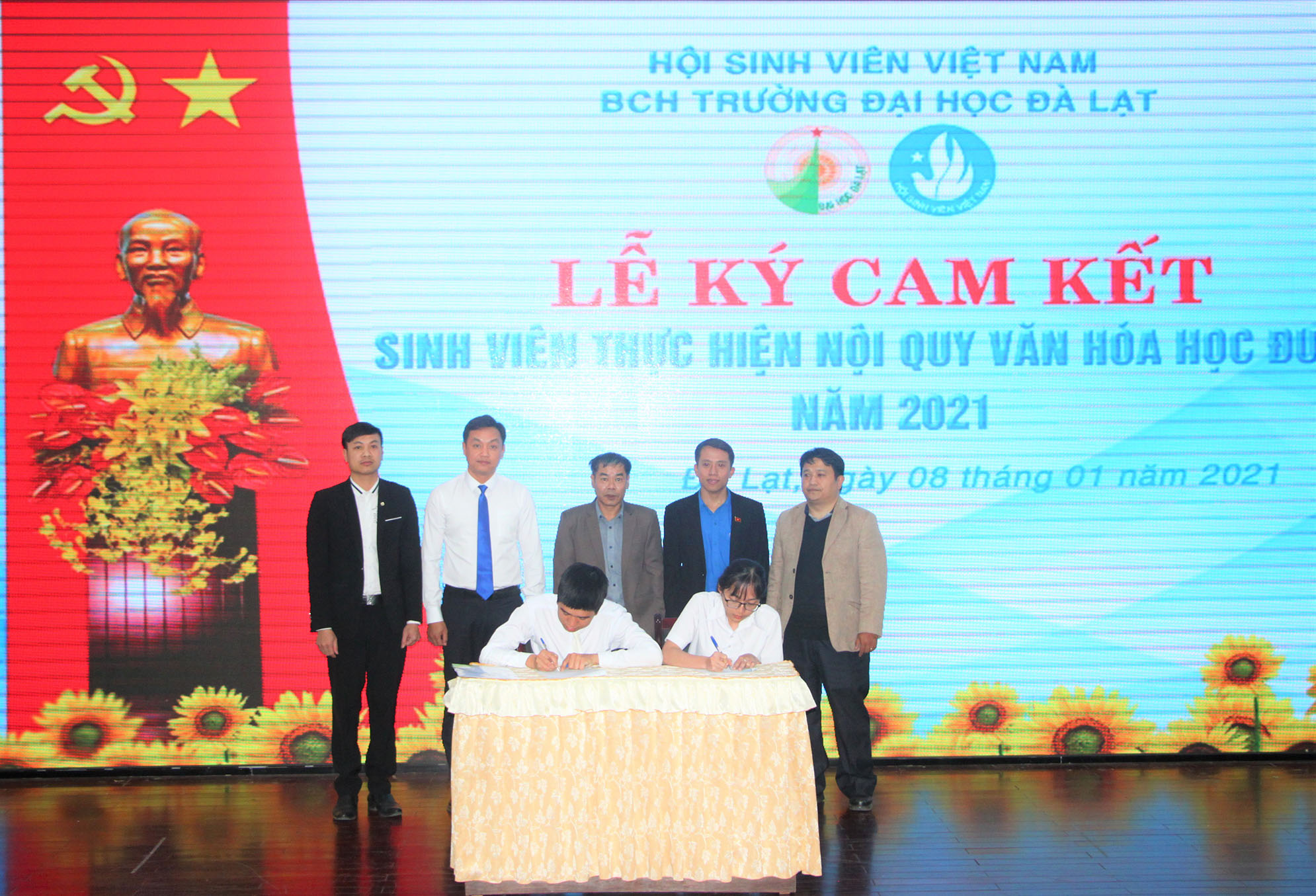 Tại buổi lễ, đại diện của các khoa, câu lạc bộ và chi bộ sinh viên của Trường đã cùng nhau ký cam kết Sinh viên thực hiện nội quy văn hóa học đường Trường Đại học Đà Lạt năm 2021 với 9 tiêu chí: (1) Trang phục khi đến trường phải gọn gàng, lịch sự, kín đáo, phù hợp với thuần phong mỹ tục; (2) Có thái độ lễ phép, tôn trọng cán bộ, giảng viên, nhân viên của Trường, lịch sự, nhã nhặn, tôn trọng lẫn nhau, có tinh thần cầu tiến, ham học hỏi, trung thực và thẳng thắn, không xúc phạm danh sự, nhân phẩm, thân thể người khác; (3) Không nói tục, không hút thuốc lá trong lớp học hoặc khuôn viên trường, không sử dụng điện thoại di động khi lên lớp, đi họp; (4) Không tự ý di chuyển trang thiết bị của Trường ra khỏi vị trí đã sắp xếp, lắp đặt, không hủy hoại, phá phách làm hư hỏng các trang thiết bị và các tài sản khác của Trường, giữ gìn và sử dụng an toàn, tiết kiệm, hiệu quả tài sản của Trường và của cá nhân; (5) Vệ sinh lớp học trước và sau giờ lên lớp, giữ gìn vệ sinh chung trong lớp học và khuôn viên Trường, không phá hoại cây cối, hái hoa, bẻ cành,… không xả rác bừa bãi trong lớp học và khuôn viên Trường; (6) Sử dụng điện, nước đúng mục đích, hiệu quả và tiết kiệm, tắt đèn, máy chiếu và các thiết bị điện trong các phòng học sau khi tan học; (7) Không tự ý viết, vẽ, dán, đạp chân lên tường, bàn, ghế trong các phòng học, phòng họp, thư viện, phòng ở ký túc xá và các khu vực khác trong khuôn viên Trường, không treo, dán áp phích, băng rôn, biểu ngữ tại khuôn viên Trường khi chưa được phép; (8) Để xe đúng nơi quy định, không đi xe trong trong khuôn viên Trường, chấp hành đúng luật giao thông khi tham gia giao thông; (9) Xây dựng hình ảnh sinh viên Trường Đại học Đà Lạt thanh lịch.