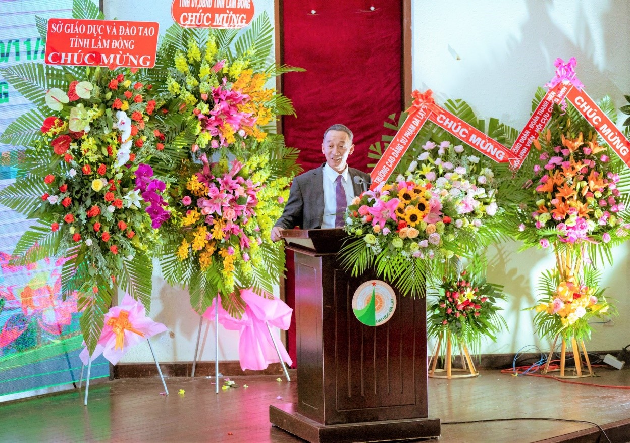 Mr. Tran Van Hiep – Deputy Secretary of Lam Dong Provincial Party Committee spoke on behalf of the provincial leaders to congratulate Dalat University on the occasion of the opening of the new school year and announce the Resolution to appoint the Vice Presidents of Dalat University for the term 2019 – 2024. He affirmed that Dalat University has made important contributions to education and providing high-quality human resources for organisations and businesses in the province and the region. At the same time, the University has established and maintained relations in research and technology transfer with localities, and relevant departments of the province. These activities, together with business cooperation activities in start-up, innovation, fostering computer and foreign language capacity, etc., have made an important contribution to economic, social, and cultural development. of Lam Dong province. In addition, Mr. Tran Van Hiep also shared that the leaders and people of Lam Dong province in general, and Dalat city in particular will continue to cooperate with Dalat University in the spirit of “mutualism” to develop even further in the future. On the occasion of Dalat University announcing the Resolution to appoint Vice Presidents for the term 2019-2024 and celebrating the 38th Vietnamese Teachers’ Day, Mr. Tran Van Hiep congratulated the two lecturers who were voted by the staff and appointed by the Board of Trustees for the position of Vice President of Dalat University for the term 2019 – 2024 and sent best wishes to generations of lecturers of Dalat University.