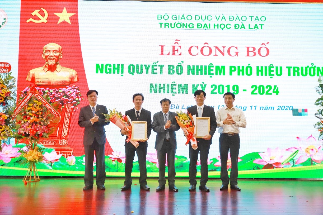 At this ceremony, the Dalat University Board of Trustees announced the Resolution on the appointment of Vice Presidents for the 2019-2024 term. Dr. Nguyen Van Vinh – Deputy Secretary of the Party Committee, Chairman of Dalat University Board of Trustees awarded the Resolution to appoint two Vice Presidents: Assoc. Prof. Dr. Nguyen Tat Thang (Member of the Party Committee, Senior Lecturer, Head of Department of Personnel and Administration) and Dr. Mai Minh Nhat (Member of the Standing Committee of the Party Committee, Main Lecturer, Head of Department of Postgraduate Academic Affairs).