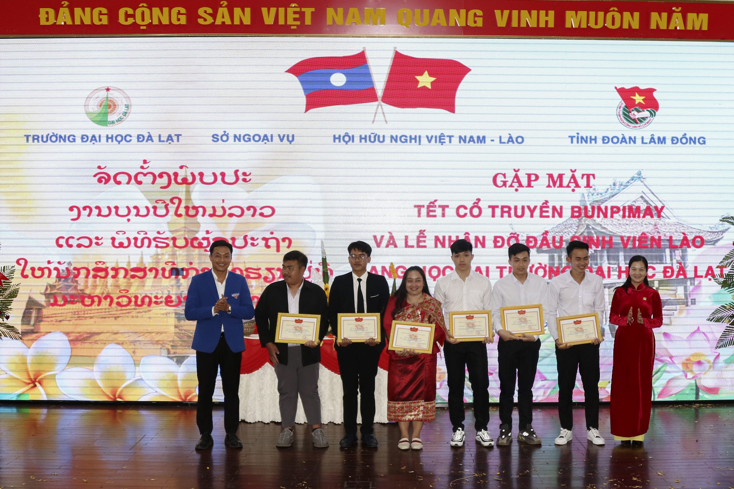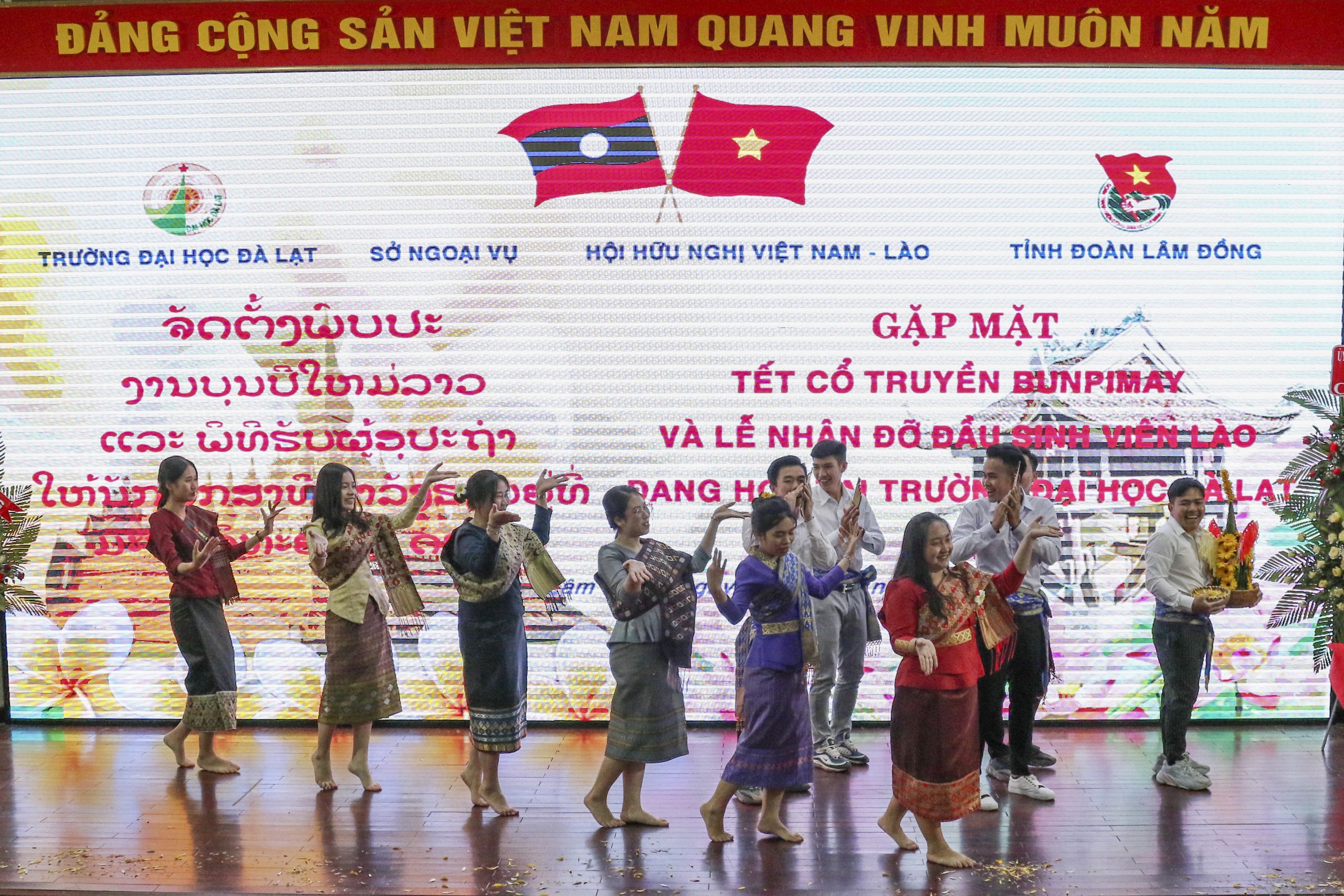 On the afternoon of April 19, Da Lat University cooperated with the Vietnam – Laos Friendship Association of Lam Dong province, the Department of Foreign Affairs of Lam Dong province and the HCM Communist Youth Union of Lam Dong province to solemnly celebrate the traditional Bunpimay of the Laotian people and welcoming ceremony for 22 Lao students studying at the University to their host families.