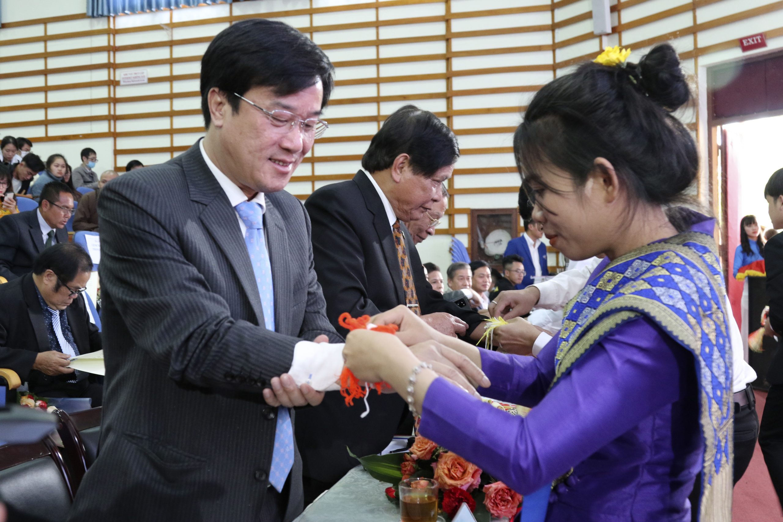 The custom of tying strings around the wrist (Baci ceremony) is a unique cultural feature, showing hospitality to friends of the Lao people. Tying the wrist with wishes of peace and good luck is a tradition that each Laotian gives to those around and international friends to convey the message of friendship. This is a very old custom, bearing the cultural and spiritual beauty of the people of the land of Million Elephants. Therefore, on this occasion, Lao students respectfully conducted the ceremony of tying the wrists for delegates and host families attending the ceremony.