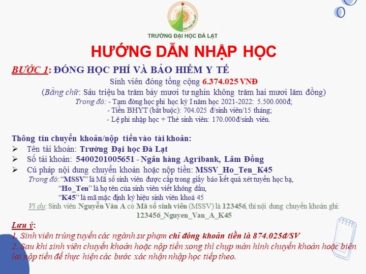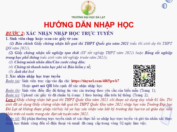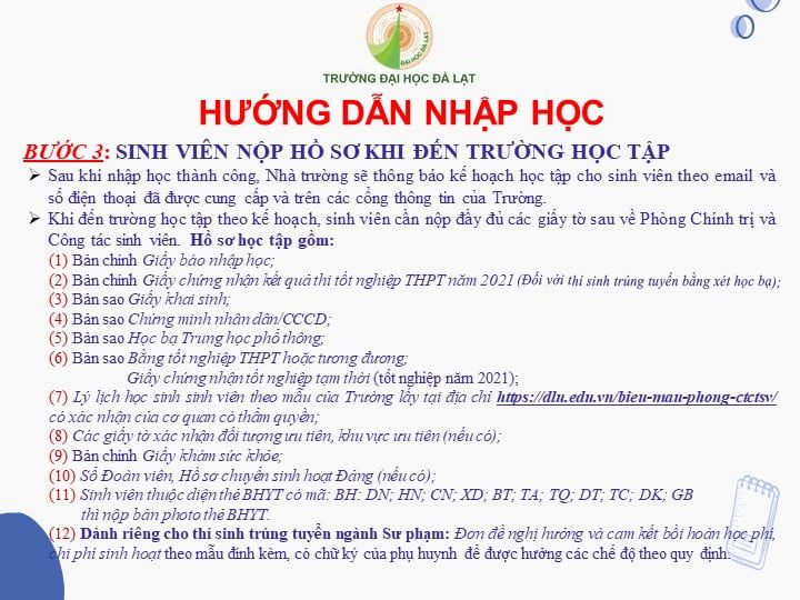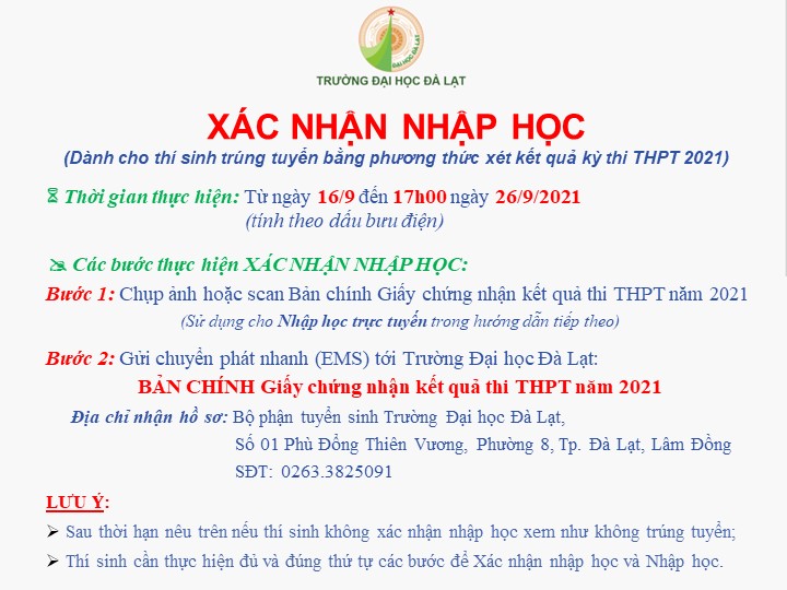 Lưu ý: Bước này chỉ dành cho thí sinh trúng tuyển bằng phương thức xét kết quả kỳ thi THPT Quốc gia 2021) Thời gian thực hiện: Từ 16/9 đến 26/9/2021Thời gian thực hiện: Từ 16/9 đến 26/9/2021Thời gian thực hiện: Khi có thông báo tập trung tại Trường Đại học Đà Lạt