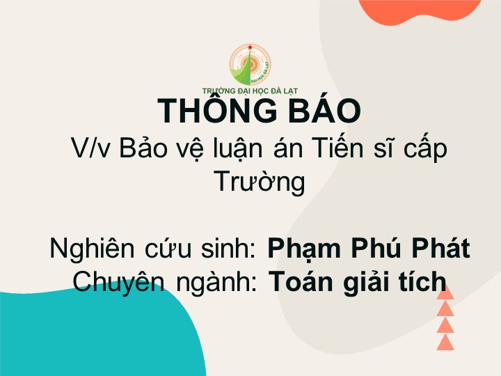 Trường Đại học Đà Lạt thông báo về lịch bảo vệ luận án tiến sĩ cấp Trường của nghiên cứu sinh Phạm Phú Phát – Chuyên ngành Toán giải tích. Trân trọng kính mời các nhà khoa học, giảng viên, nghiên cứu sinh, học viên cao học, sinh viên và cá nhân quan tâm đến tham dự. Nội dung toàn văn luận án, tóm tắt luận án và trang thông tin những đóng góp mới về mặt học thuật, lý luận, luận điểm mới về khoa học và thực tiễn của luận án xin vui lòng xem trong file đính kèm.