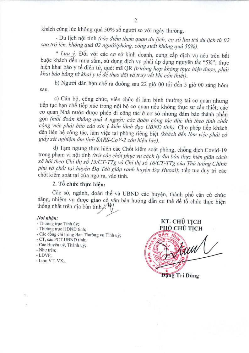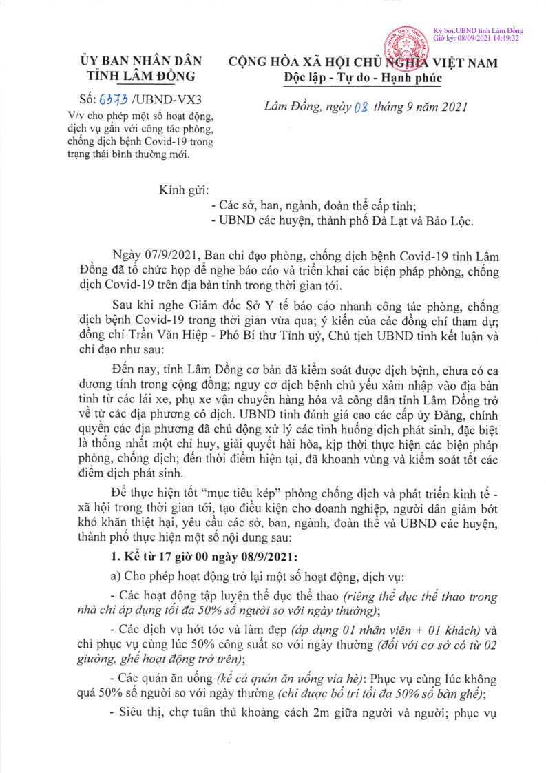Công văn số 6373/UBND-VX3 ngày 08/9/2021 của UBND tỉnh Lâm Đồng về việc cho phép một số hoạt động, dịch vụ gắn với công tác phòng, chống dịch bệnh Covid-19 trong trạng thái bình thường mới.