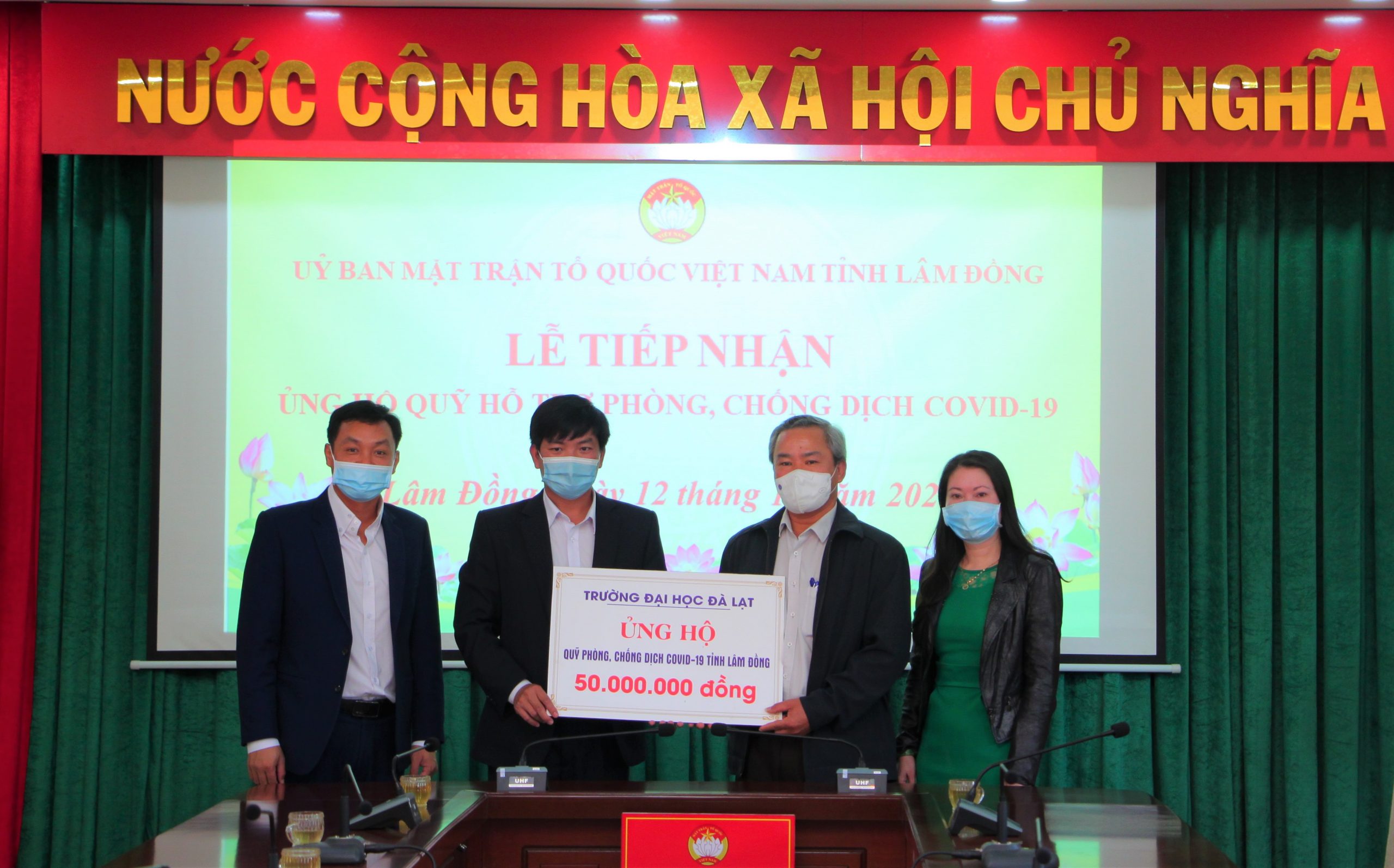 Vào sáng ngày 12/10/2021, đoàn công tác của Trường Đại học Đà Lạt gồm TS. Mai Minh Nhật – Phó Hiệu trưởng; bà Lê Thị Quỳnh Hảo – Chủ tịch Công đoàn Trường; ông Phan Tuấn Anh – Phó Trưởng phòng Tổ chức Hành chính đã đến Ủy ban Mặt trận Tổ quốc Việt Nam tỉnh Lâm Đổng để trao số tiền 50 triệu đồng ủng hộ vào Quỹ phòng, chống dịch Covid-19 của Tỉnh. Số tiền này được trích từ quỹ phúc lợi của Trường.