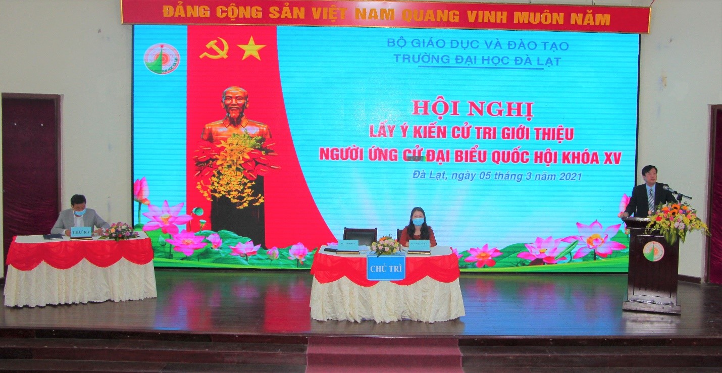 Căn cứ Nghị quyết số 186/2021/UBTVQH14 ngày 11/01/2021 của Ủy ban Thường vụ Quốc hội về việc quy định chi tiết, hướng dẫn về việc tổ chức hội nghị cử tri; việc giới thiệu người ứng cử đại biểu Hội đồng nhân dân cấp xã ở thôn, tổ dân phố; việc hiệp thương, giới thiệu người ứng cử đại biểu Quốc hội, đại biểu Hội đồng nhân dân trong bầu cử bổ sung; Căn cứ Nghị quyết liên tịch số 09/2021/NQLT-UBTVQH14-CP-ĐCTUBTWMTTQVN ngày 15/01/2021 của Chính phủ – Đoàn Chủ tịch Ủy ban Trung ương Mặt trận Tổ quốc Việt Nam – Ủy ban Thường vụ Quốc hội về việc hướng dẫn quy trình hiệp thương, giới thiệu người ứng cử đại biểu Quốc hội khóa XV, đại biểu Hội đồng nhân dân các cấp nhiệm kỳ 2021-2026; Căn cứ Thông báo số 78/TB-MTTQ-BTT ngày 01/03/2021 của Ủy ban Mặt trận Tổ quốc Việt Nam tỉnh Lâm Đồng về việc phân bổ cơ cấu, thành phần, số lượng người ứng cử đại biểu Quốc hội khóa XV; Căn cứ Biên bản số 160/BB-ĐHĐL ngày 02/03/2021 của Tập thể lãnh đạo và Chủ tịch Công đoàn Trường về việc thống nhất nội dung, quy trình giới thiệu người ứng cử đại biểu Quốc hội khóa XV, vào chiều ngày 05/03/2021, Trường Đại học Đà Lạt tổ chức giới thiệu người ứng cử đại biểu Quốc hội khóa XV theo quy trình 3 bước, dưới sự chủ trì của TS. Lê Minh Chiến – Bí thư Đảng ủy, Hiệu trưởng Trường Đại học Đà Lạt.