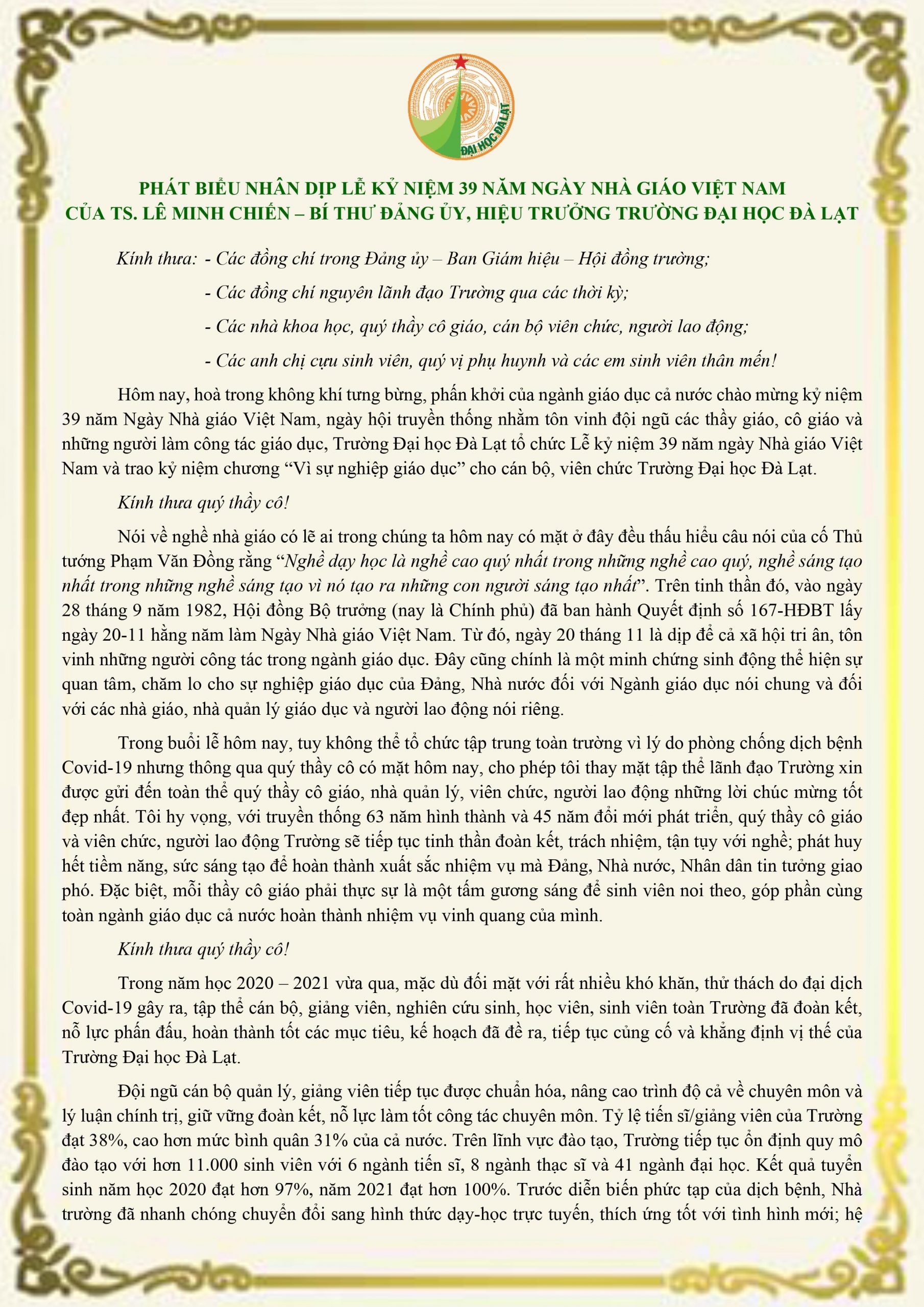 Phát biểu tại buổi lễ, TS. Lê Minh Chiến đã gửi lời chúc mừng tốt đẹp nhất đến toàn thể quý thầy cô giáo, nhà quản lý, viên chức, người lao động của Trường nhân dịp kỷ niệm 39 năm Ngày Nhà giáo Việt Nam. Hiệu trưởng đã điểm lại những thành tựu mà Trường đã đạt được trong năm học 2020 – 2021 và những nhiệm vụ trọng tâm của năm học mới 2021 – 2022. Mặc dù phải đối mặt với rất nhiều khó khăn, thử thách do đại dịch Covid-19 gây ra, tập thể viên chức, người lao động và người học toàn Trường vẫn luôn đoàn kết, nỗ lực phấn đấu, hoàn thành tốt các mục tiêu, kế hoạch đề ra, tiếp tục củng cố và khẳng định vị thế của Trường Đại học Đà Lạt trong hệ thống giáo dục đại học Việt Nam. Hiệu trưởng cũng mong muốn quý thầy, cô giáo, viên chức, người lao động của Trường sẽ tiếp tục nâng cao hơn nữa tinh thần đoàn kết, lòng trách nhiệm, sự tận tụy và tâm huyết với nghề, phát huy hết tiềm năng, sức sáng tạo để hoàn thành xuất sắc các nhiệm vụ được giao; đồng thời, mỗi thầy cô giáo phải thực sự là một tấm gương sáng để sinh viên noi theo, góp phần cùng toàn ngành hoàn thành nhiệm vụ vinh quang của mình. Hiệu trưởng Trường Đại học Đà Lạt trân trọng gửi lời cảm ơn đến lãnh đạo Tỉnh ủy, UBND tỉnh Lâm Đồng; Thành ủy, UBND thành phố Đà Lạt; các sở ban ngành và Phường 8; các nhà hảo tâm, các doanh nhân – doanh nghiệp. Hiệu trưởng cũng bày tỏ lòng tri ân đến các nhà giáo, nhà quản lý của Trường qua các thời kỳ, các cựu sinh viên, quý phụ huynh về sự quan tâm, hỗ trợ và giúp đỡ trong suốt quá trình phát triển của Trường.
