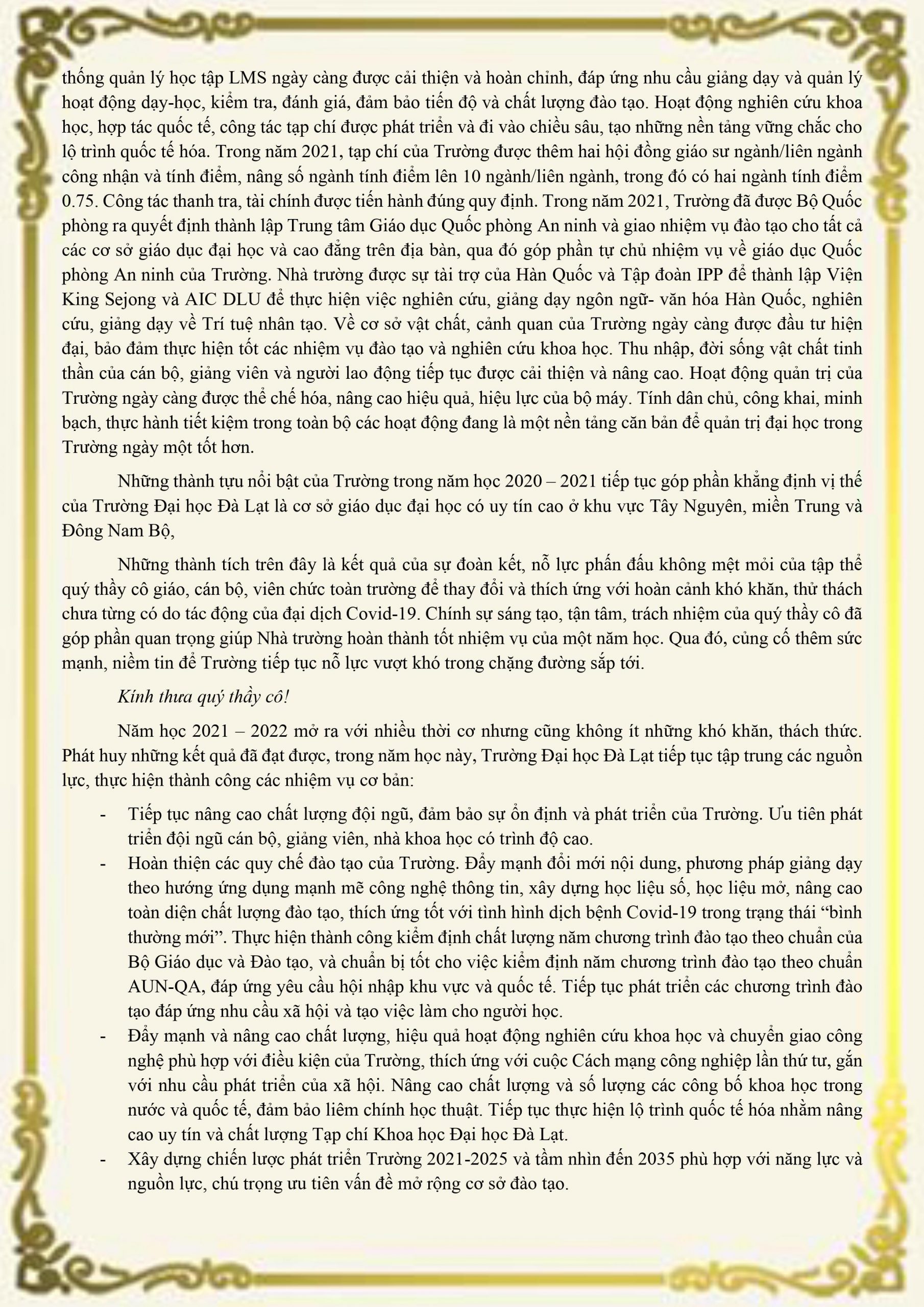 Phát huy những giá trị vốn có và truyền thống “tôn sư trọng đạo”, tập thể lãnh đạo, viên chức, người lao động và người học Trường Đại học Đà Lạt sẽ tiếp tục phấn đấu không mệt mỏi để đạt được những mục tiêu và kỳ vọng trên những chặng đường sắp tới, hướng đến tầm nhìn phát triển Trường Đại học Đà Lạt thành đại học mang tầm khu vực.