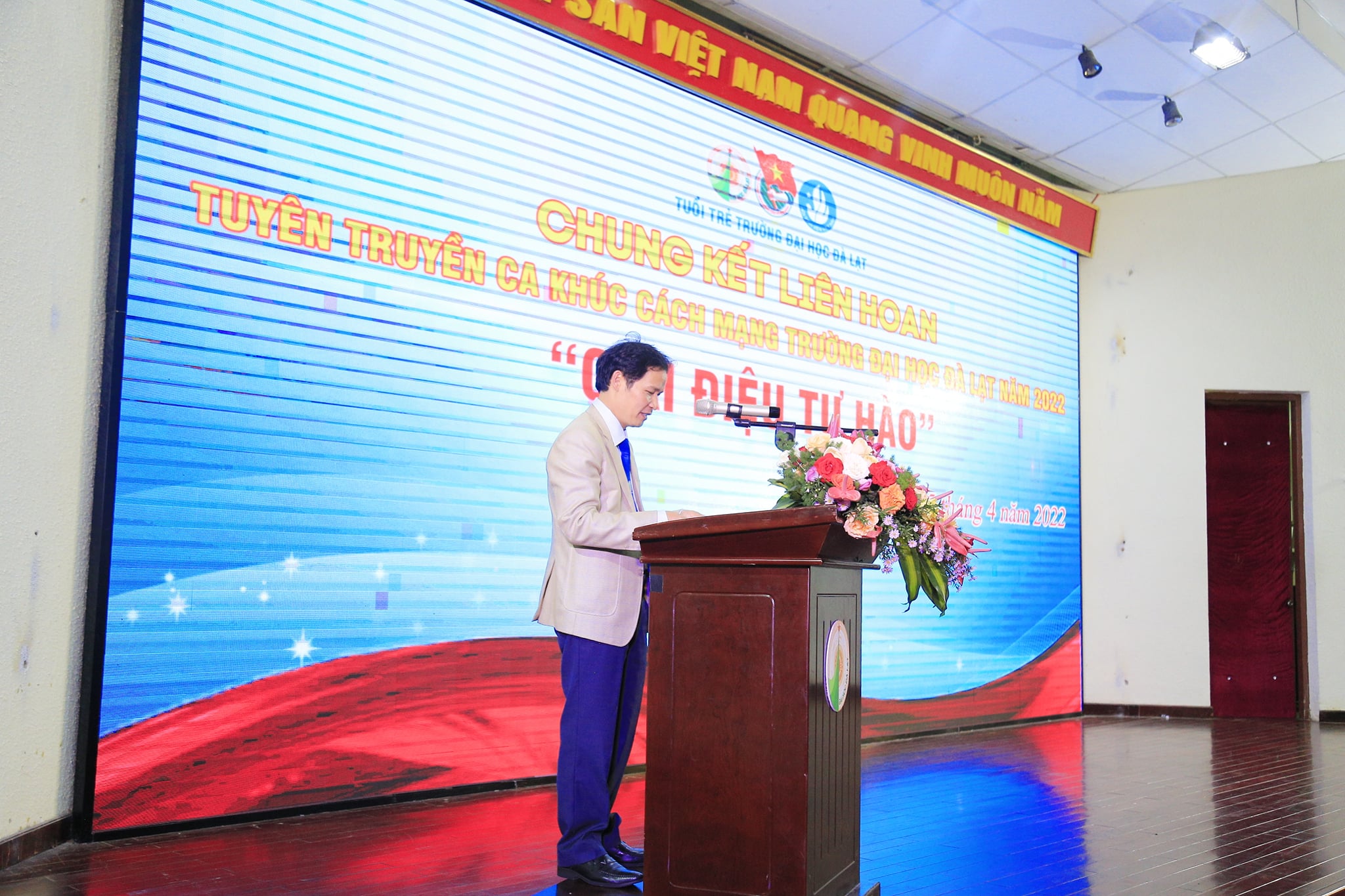 Phát biểu tại Liên hoan, PGS.TS. Nguyễn Tất Thắng – Phó Hiệu trưởng Trường Đại học Đà Lạt chia sẻ: Với chủ đề “Giai điệu tự hào”, Liên hoan Tuyên truyền ca khúc cách mạng năm 2022 là dịp để tuổi trẻ nhà trường vun đắp tình yêu quê hương, đất nước, thắp lên niềm tin, lý tưởng, định hướng lối sống, khát vọng cống hiến, sẵn sàng dấn thân tiên phong trên mọi mặt trận và thể hiện lời tri ân của tuổi trẻ hôm nay gửi đến các bậc cha anh đi trước.